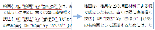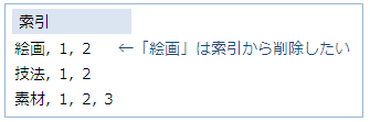 例:「絵画」という索引項目を一括削除する → { XE "絵画" \y "かいが"}