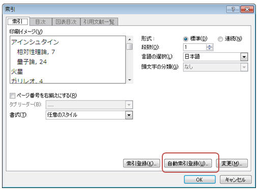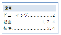 「段数」や「書式」を任意で指定し「OK」をクリック ↓索引が作成されました。 ※ 索引登録時に「読み」も入力した場合は、五十音順で表示できます。(読みがない場合は文字コード順)