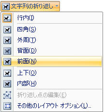 表示されたリボンの「書式」タブ−「配置」−「文字列の折り返し▼」をクリックし、「行内」以外をクリック