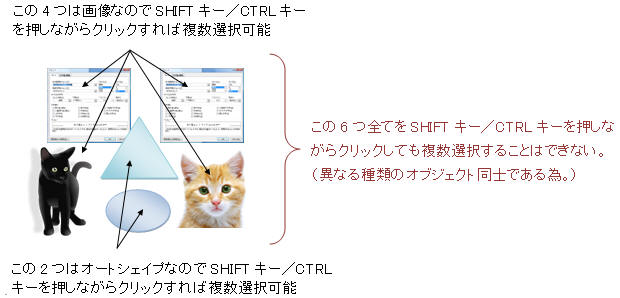 異なる種類のオブジェクトはSHIFTキーやCTRLキーを使って複数選択をすることができません。