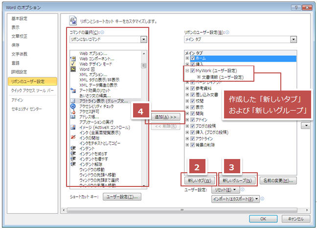 コマンド(機能)の追加先として、右側のタブ一覧から選択(または「新しいタブ」をクリックしてタブ作成)