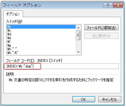 「フィールドコード」ボックスに、索引の対象範囲のブックマーク名を入力(「dog」なら、\b