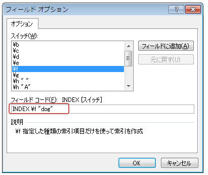 「フィールドコード」ボックスに、索引項目の種類(例ではdog)を入力し「OK」−「OK」をクリック
