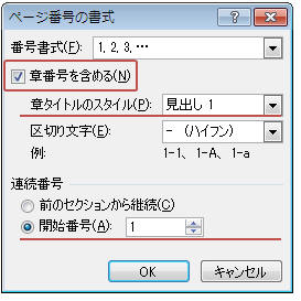 「章番号を含める」にチェックを入れ、章見出しとして使用しているスタイル(見出し1など)を選択して「OK」をクリック (※各章ごとにページ番号を開始したい場合は「開始番号」を「1」にしてください。但し章ごとにセクションで区切る必要があります。)