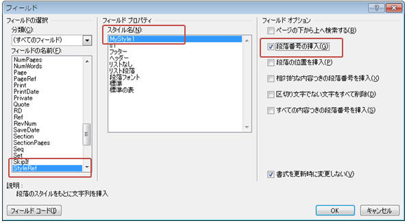 「フィールドの名前」で「StyleRef」を選択し、「スタイル名」で章見出しとして使用しているスタイルを選択