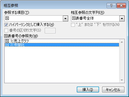 「相互参照の文字列」として「図表番号全体」や「番号とラベルのみ」を選択し「挿入」をクリック