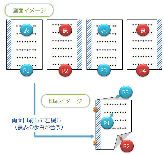 → 見開きページにしなくてもよいなら(両面印刷でも左右の余白や綴じ代が同じなら)標準に設定します。