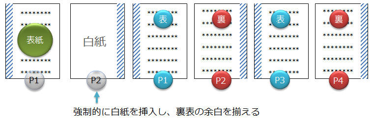白紙が強制挿入されるのは、例えば表紙(P1)、1枚目(P1)…のように奇数・奇数で連続しているからです(偶数白紙ページ挿入で調整)なので表紙