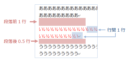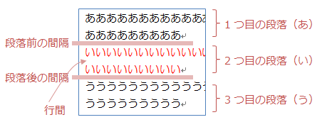 まず「段落前」とは、その段落(い)から前の段落(あ)までの間隔を指します。 同様に「段落後」とは、段落(い)から次の段落(う)までの間隔を指します。「行間」は「い」の段落に入力されている2行「いいい…」の間隔を指します。