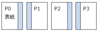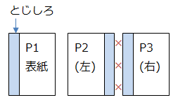 結果として 表紙の次のページは2ページ目ですがマイナス1によりP1と表示されます。(以降同様)そのため綴じしろも変更されます。 |