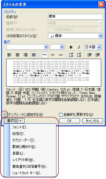 デフォルトの文字列(標準スタイル)に段落書式や罫線なども設定したい場合は、適宜「書式(O)▼」