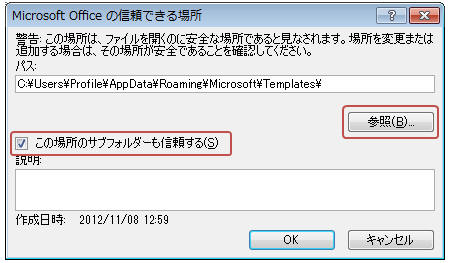 「参照」をクリックしてフォルダを指定(サブフォルダも信頼できる場所にする場合は「この場所のサブフォルダ―も信頼する」にチェック)