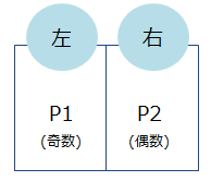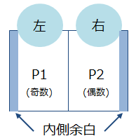 (※ページの配置ではなく綴じ代(余白)の配置です。例えば袋とじの綴じ代は外側であり、横書きは左綴じなので【奇数ページ=左側】【偶数ページ=右側】の綴じ代になります)※縦書きのページ配置は逆です。右(p1)→左(p2)