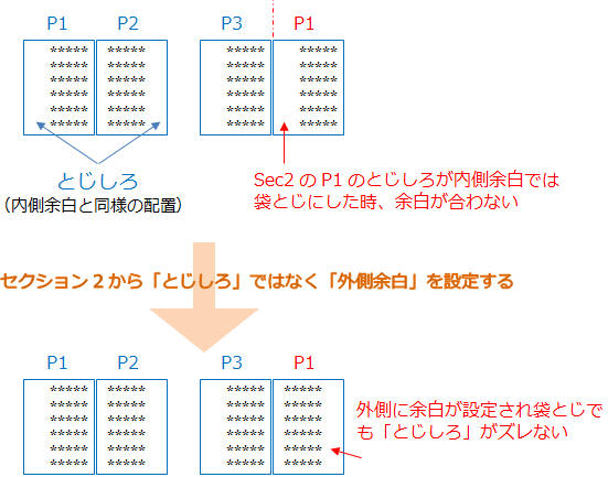 袋とじの「とじしろ」はページ外側(奇数は左、偶数は右)に配置されます(=袋とじにすると内側なので内側余白と同配置)なので、とじしろの位置を逆にしたい場合は、該当セクションのみ外側余白を設定すればズレません。
