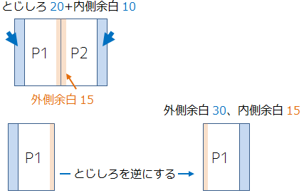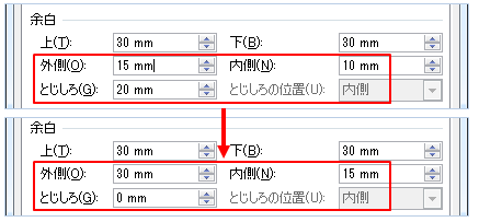 「余白」タブで「とじしろ」を0にし、とじしろ+内側余白を外側余白にする