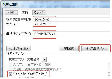 (2) ルビの実態であるEQフィールドから検索した文字列(*)の部分をそのまま返す必要があるので、置換後の文字列には\1を指定します。ここで他に何も指定しないとフィールドコードのカッコと文字列のみが文書に残ることになり{文書}、フィールド更新後何も表示されず、一括して削除する手もありません。そこでCOMMENTSフィールドに置換すればCtrl+Shift+F9キーで一括してフィールドを通常の文字列に戻すことができます。(よくEQフィールドで置換するという手順をネットでみかけますが、EQフィールドはCtrl+Shift+F9キーで通常の文字列に戻すことはできません。