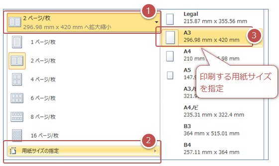 「2ページ枚/▼」を再度クリックし「用紙サイズの指定」から印刷サイズ(A3など)を指定
