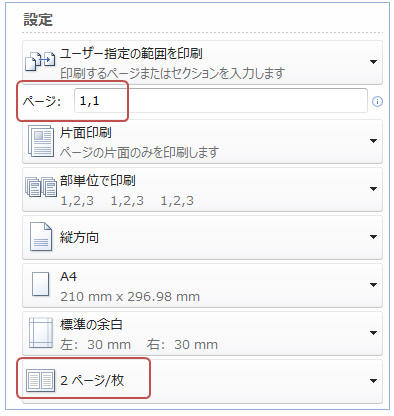 「 ファイル」タブ−「印刷」をクリック 「ページ」ボックスに「1,1」と入力し「2ページ/枚」を選択 「2ページ枚/▼」を再度クリックし「用紙サイズの指定」から印刷サイズ(A3など)を指定 「印刷」をクリック ★補足:同様に「1,1,1,1」と入力して「4ページ/枚」とすると同じページを1枚の用紙に4枚分印刷できます。
