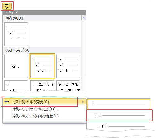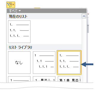 「ホーム」タブ-「アウトライン」ボタンから適当なリストをクリック(番号は後から変更します) ↑↑アウトラインボタン内にはレベルに応じたアウトライン番号が1つのセットとしてまとめられている 「リスト」が用意されています。