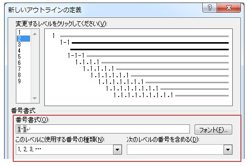 ■ 番号書式を変更したい(1-1など、上位の番号も含める場合)