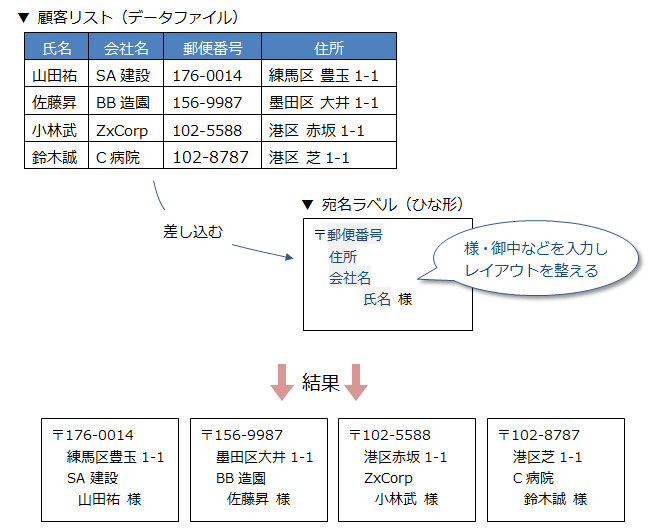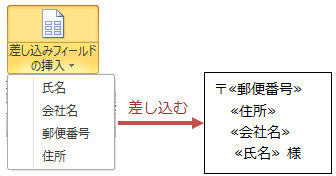 1つ目のセルにのみ「様」「〒」などを入力し「差し込みフィールドの挿入▼」からフィールドを差し込む