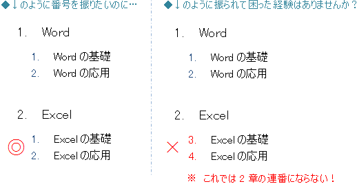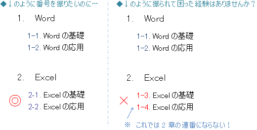 アウトライン番号は全ての見出しで共通の設定を使います。番号の振り直しができない見出しが