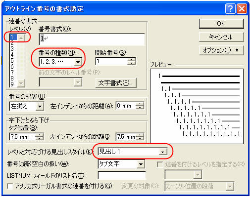 「前の文字のレベル番号」=「レベル1」を選択