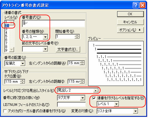「レベルと対応づける見出しスタイル」=「見出し2」とし、「連番を付けるレベルを指定する