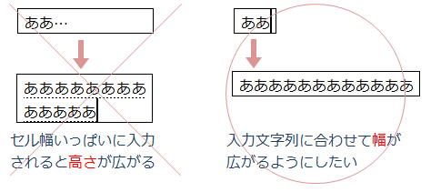 既定では、幅いっぱいに文字が入力されると折り返されて(自動的に高さが調整)表示されます。ここでは幅が自動調整される方法をご紹介します。