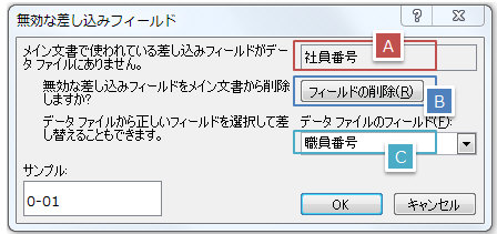 「無効な差し込みフィールド」(上図)が表示されたら「データファイルのフィールド」から、 フィールドを選択