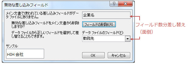 ▼ データファイル変更時に表示される「無効な差し込みフィールド」。メイン文書の「企業名」とデータファイルの「勤務先」を差し替える必要がある。
