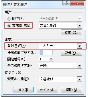 「文末脚注」をクリックし「番号書式」で「1,2,3…」を選択