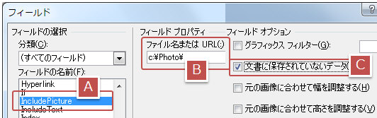 ※ その他の入力方法としてCtrl+F9キーでフィールドコードを手入力することもできます。手入力でパスを指定する場合は、¥記号1個を2個に置き換えて入力してください。(C:\\Cat\\a.jpgのように)