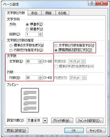 ページ設定ダイアログに「原稿用紙の設定にする」と「文字数と行数を指定する」があります。これらは