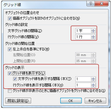 ★1:1マス単位でグリッド線を表示するには「ページ設定」ダイアログ−「文字数と行数」タブ−「グリッド線」をクリックし「文字グリッド線の間隔=1字」「行グリッド線の間隔=1行」「文字グリッド線を表示する間隔=1」とします。