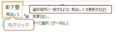 「ホーム」タブの「スタイル」にある見出し1を右クリックし「選択箇所と一致するように見出し1を更新する」をクリック