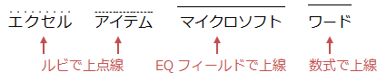 文字の上に点・点線を引く場合、「ルビ」を使うと簡単にできます。