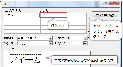 「文字列全体」ボタンがアクティブになっている場合はクリックし、ルビに点を入力し「OK」をクリック