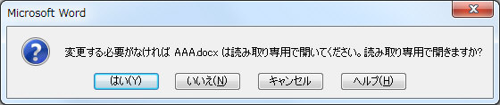 「はい」… 読み取り専用で開くため、上書き保存はできず「名前を付けて保存」のみ可能 「いいえ」… 読み取り専用ではないため、上書き保存が可能だが、開く度このメッセージが表示される 「キャンセル」… 開きません。