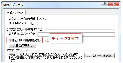 「ファイル」タブ−「名前を付けて保存」をクリック 「ツール▼」−「全般オプション」をクリック 「読み取り専用を推奨」のチェックを外し「OK」をクリック 名前を付けて保存する