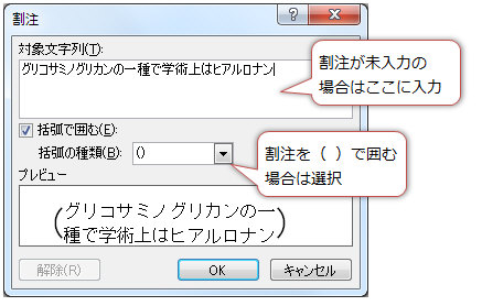 「対象文字列」に割注が表示される。(又は入力)割注をかっこで囲む場合は「括弧で囲む」にチェックを入れ「OK」をクリック