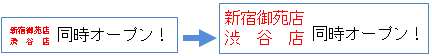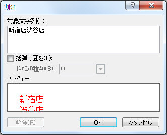 割注は自動的に真ん中で改行します。2つの文字数が異なると希望通りに改行されません。例えば「新宿御苑店