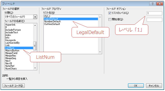 ★下位レベルの番号を挿入する場合は{ListNum \l 2}などとします。