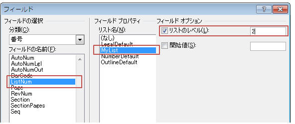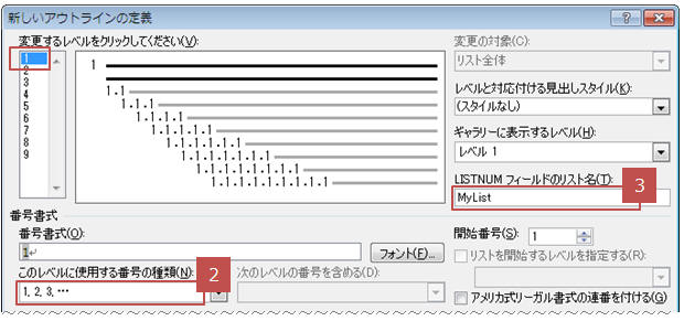 各レベルで番号が定義されていることを確認し「LISTNUMフィールドのリスト名」を入力