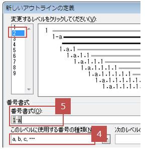 「1-a」など上位レベルとつなげたい場合は「番号書式」