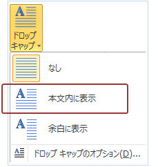 「挿入」タブ−「ドロップキャップ」−「本文内に表示」をクリック