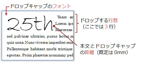 ドロップキャップでは【フォント】【ドロップする行数】【本文とドロップキャップの距離】を指定できます。