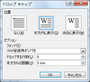 ※左余白にドロップキャップしたい場合は「余白に表示」をクリック