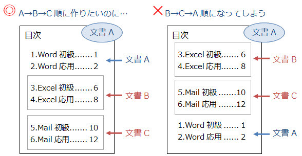 例えば文書Aに、文書A+文書B+文書Cの目次を作成すると、A→B→C順ではなくB→C→A順に目次が挿入されてしまう 、というものです。 原因と解説