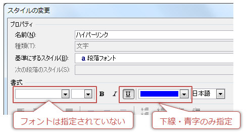 ▼ハイパーリンクスタイルの詳細。フォントは指定されていないことが分かります。